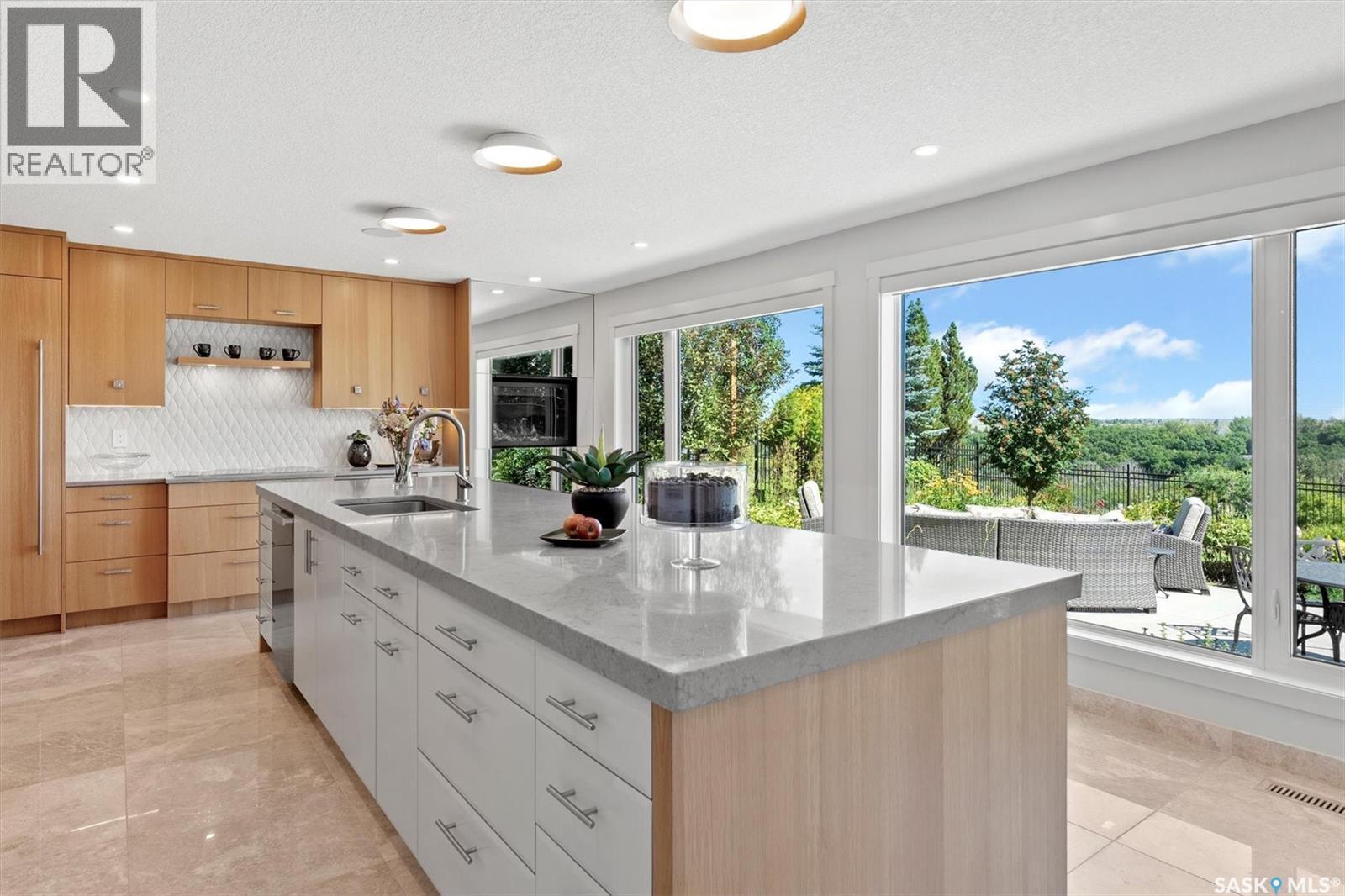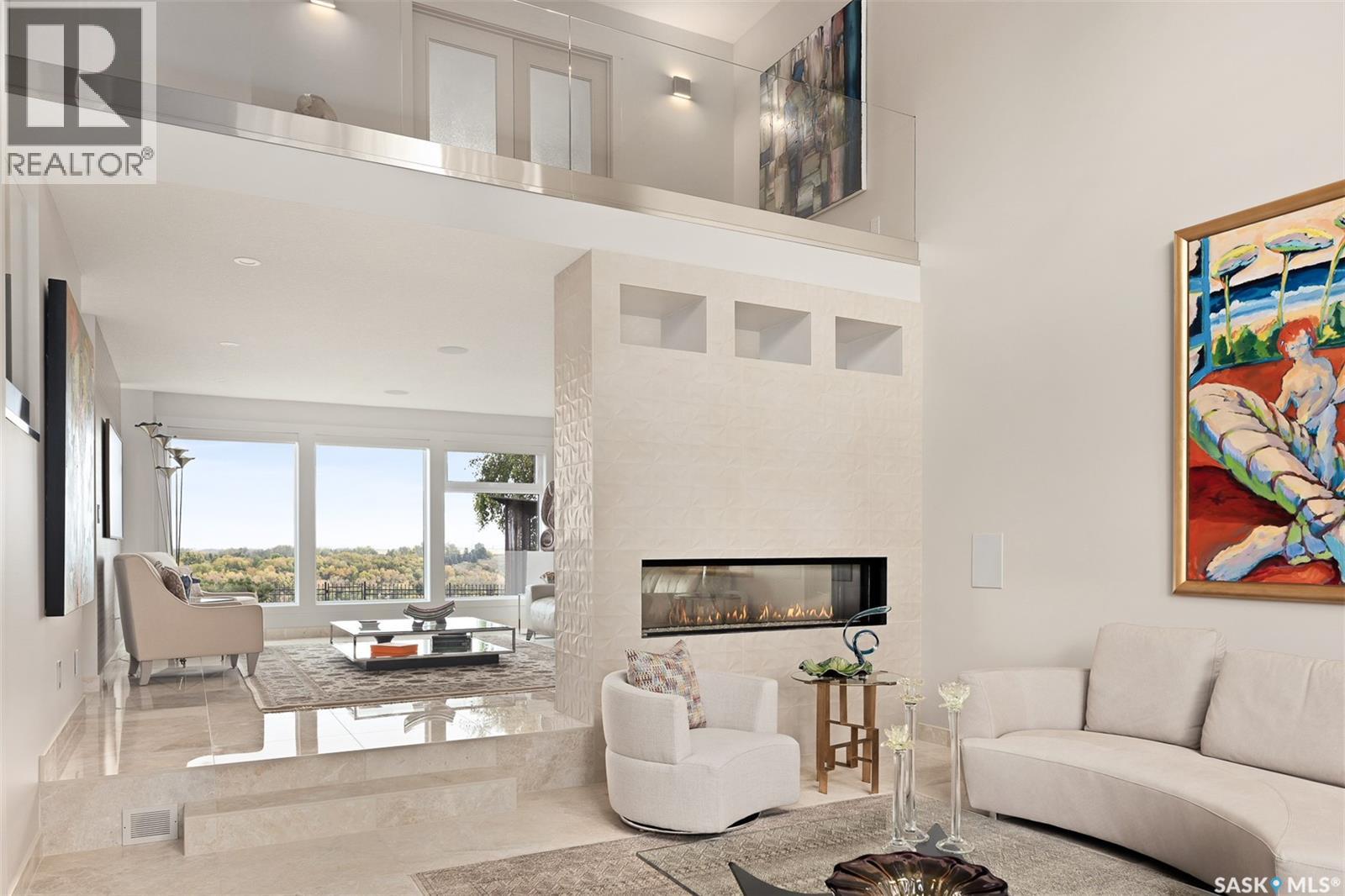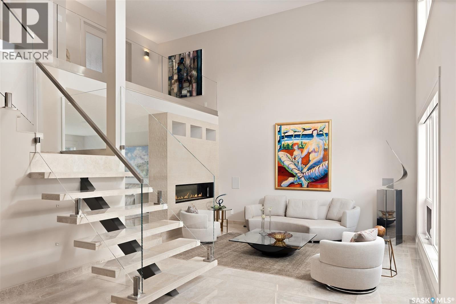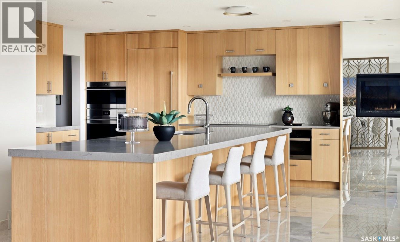 Rare riverfront lot just steps away from the S Sask River seamlessly integrates urban living with breathtaking sunrises, sweeping vistas, walking paths and the sounds of nature. Modern architecture meets Meewasin heritage with a 5-bedroom, 4-bath, and triple garage home. Extensively renovated from the foundation up, find floating steel stairs, 24×24 marble flooring and natural light flowing from the 52’ wall of continuous river view windows. The chef’s kitchen feels like the heart of the home- a gas fireplace oversees a 13’ kitchen island, Sub-Zero, Wolf and Miele appliances, a prep counter with 2nd sink and a walk-in pantry. The primary suite is your private retreat to enjoy your morning coffee on your balcony or in front of the gas fireplace. The attached ensuite has seamless marble throughout, and the bathtub is below a window for private viewing of the riverbank. The basement hosts a yoga/theatre room and a professionally developed gym with commercial flooring. Advanced mechanical, smart home, lighting, security, Lutron shades, 2 electrical panels, 3 gas fireplaces, steam sauna, audio and video systems throughout, and so much more. Boasting 100 linear feet of backyard encased in custom bronze-toned metal fencing with low-maintenance landscaping and watering. A large patio surrounded by perennials with natural gas for a fire table. A 170 sq ft solid steel and screen 3-season room equipped with an infrared heater for cool days and an automated ceiling fan for the warm days. The modern stone and stucco exterior, architectural Class 4 shingles and anodized aluminum triple-pane windows lend a quiet sophistication to the original design style. Anodized aluminum commercial-grade insulated doors lead you into a 3-car gas-heated garage with an epoxy floor. Walking distance to the Silverwood golf course, 4 elementary and 2 high schools, shopping, and restaurants. COPY AND PASTE VIDEO TOUR LINK TO TOUR THIS HOME -> https://www.youtube.com/watch?v=DvMdn_k-aNQ (id:17834)